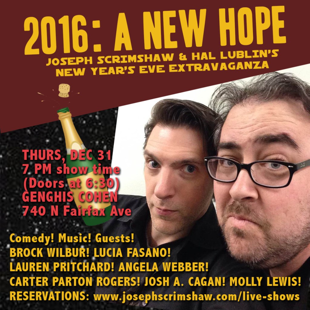 2015 – DC adjacent – Laser, Joseph Scrimshaw, Hal Lubin, Molly Lewis, Josh A Cagan, Lucia Fasano and others play at “2016: A New Hope Joseph Scrimshaw & Hal Lublin’s New Year’s Eve Extravaganza!” at Genghis Cohen in Los Angeles CA.