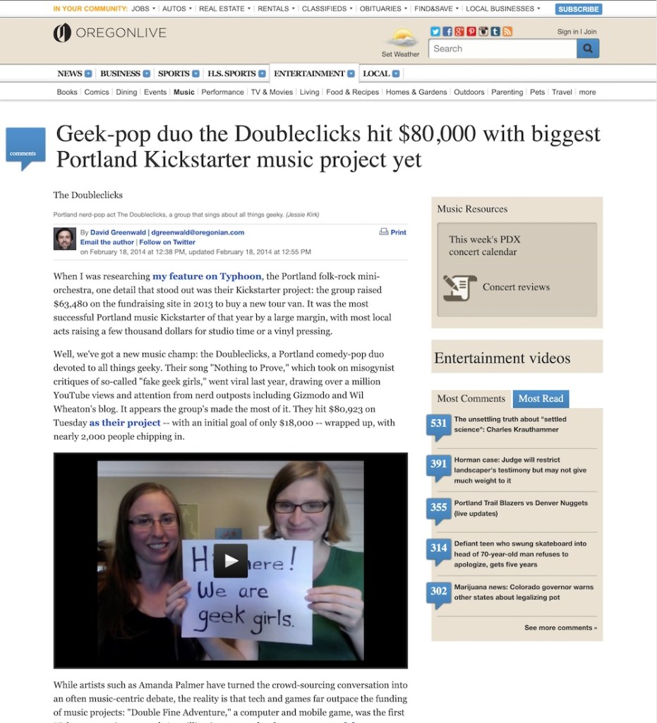 2014 – Oregonlive does a story on the success of The Doubleclicks Kickstarter. https://web.archive.org/web/20140226170046/www.oregonlive.com/music/index.ssf/2014/02/geek-pop_duo_the_doubleclicks.html