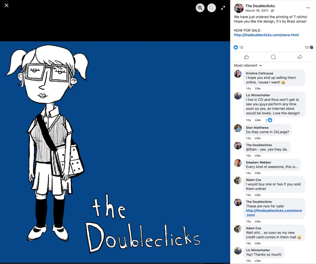 2011 – The Doubleclicks launch the first of their T-shirts (graphic designed by Brad Jonas).