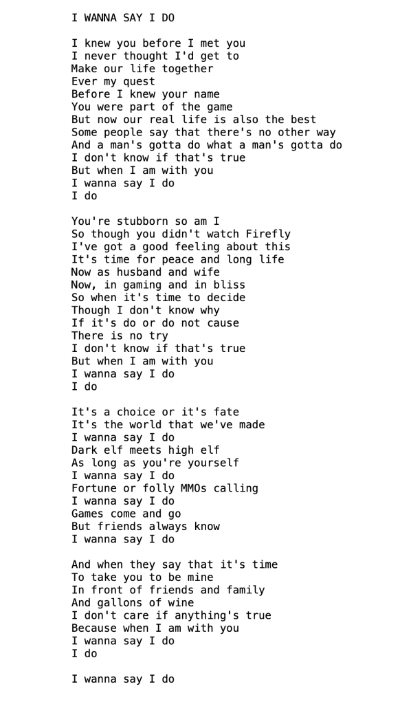 And finally, here’s “I Wanna Say I Do” in .mp3 format for your listening enjoyment. If you’ll indulge me for a moment. The first time I heard it almost a year ago I thought it was absolutely charming. Made even more so because I already knew some of the couple’s history thanks to the NYT and Offbeat Bride stories. I also thought it felt and sounded very much like a classic early Doubleclicks song, and I was really hoping that others would be able to hear it one day (for those who are curious as to why I didn’t just release it when I first found it? It was a judgment call based on its subject matter being about two specific people, and it being highly personal in nature).
