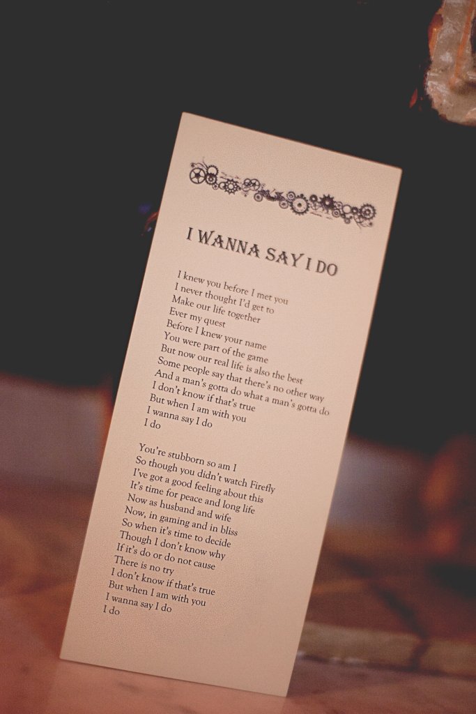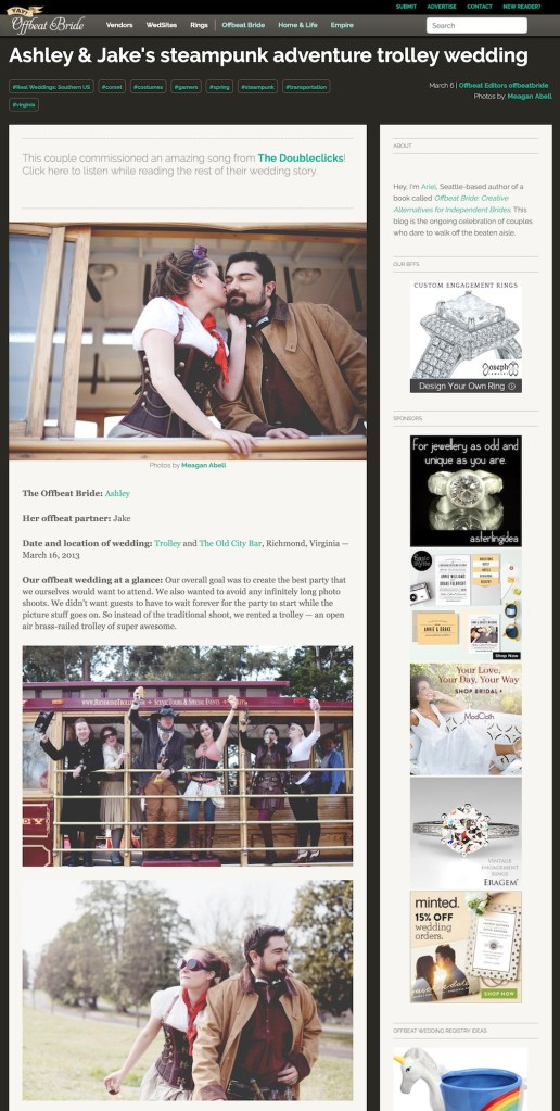 Offbeat Bride (now Offbeat Wedding) has a good story on the wedding and it’s theme, with lots of pictures, and some additional details related to the song.