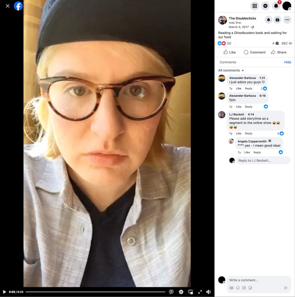 2017 – The Doubleclicks livestream on Facebook a reading of the Little Golden Book story of the Ghostbusters while they wait for their food. This is yet another video that fell victim to Facebook’s decision in early 2025 to delete all live videos older than 30 days.