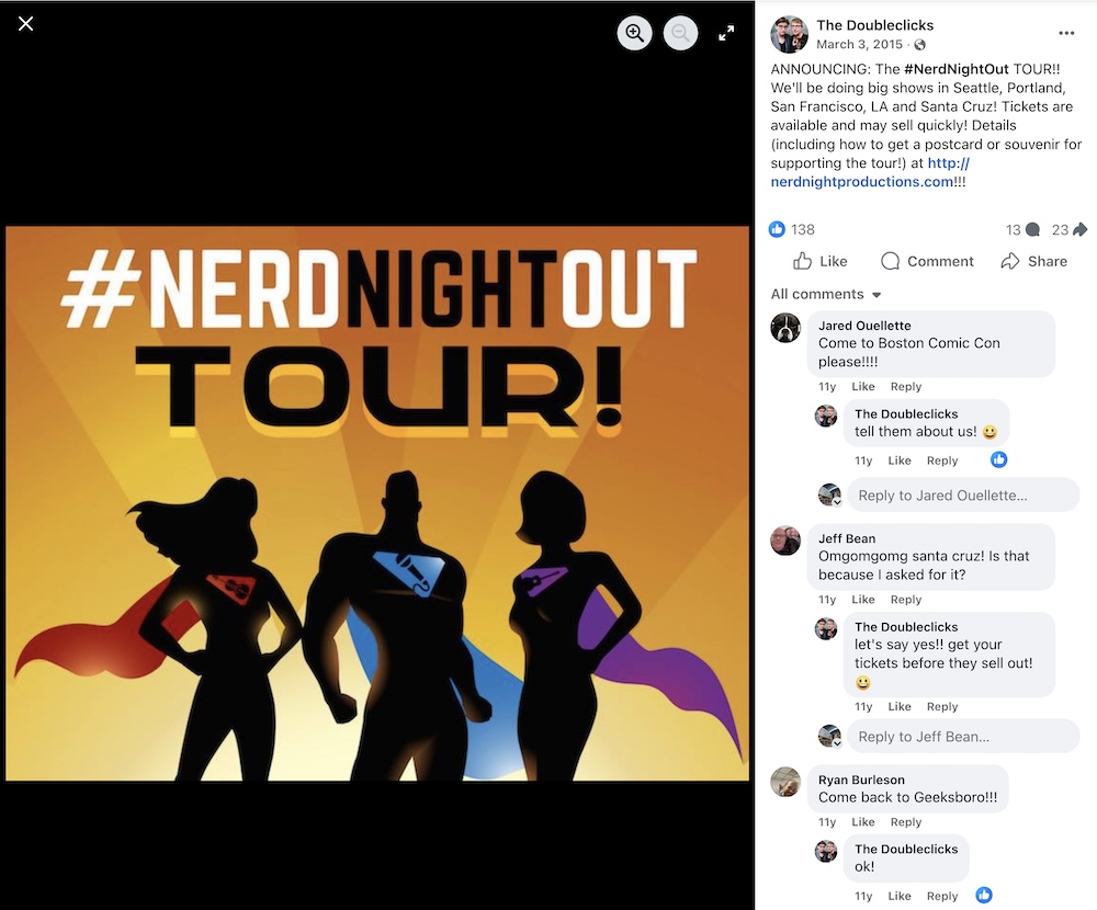 2015 – The Doubleclicks announce the #NerdNightOut tour on Facebook.