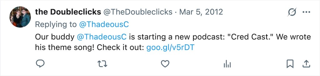 2012 – The Doubleclicks mention on Twitter that they wrote the theme song for a friend’s new podcast called “Cred Cast”.
